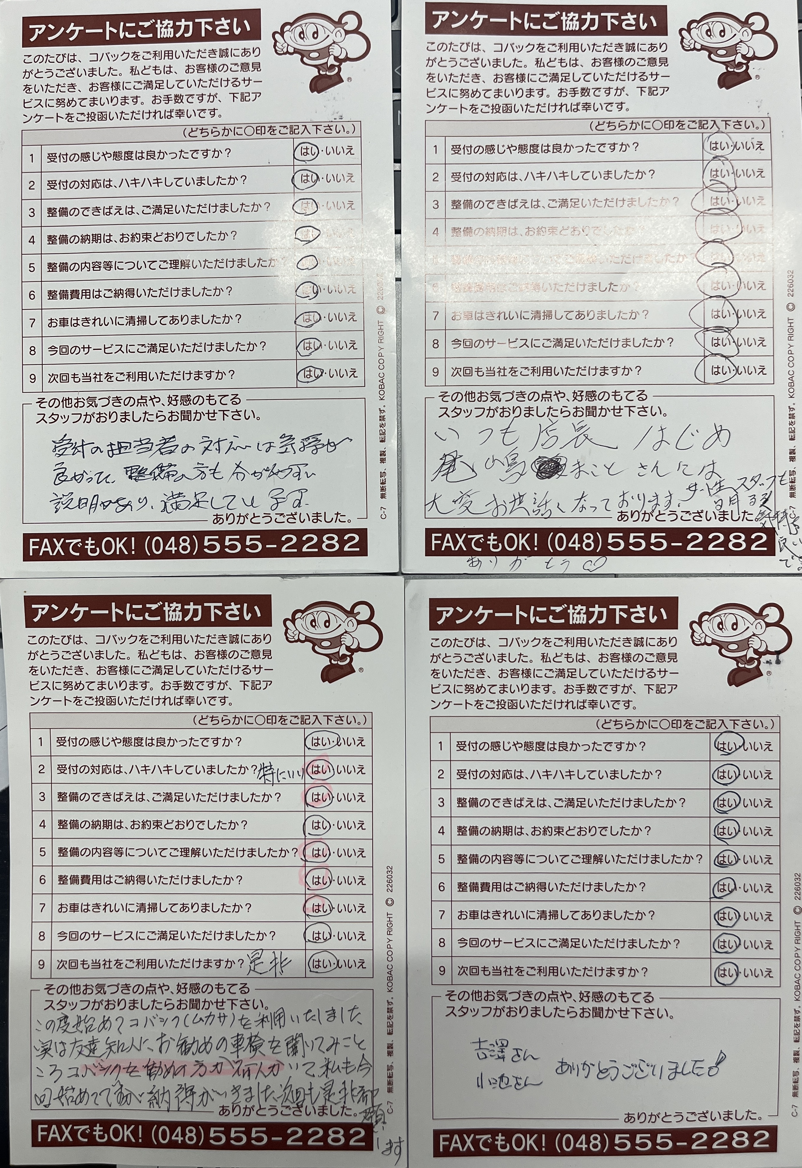 お客様からの車検後のアンケートはがき抜粋をご紹介いたします。