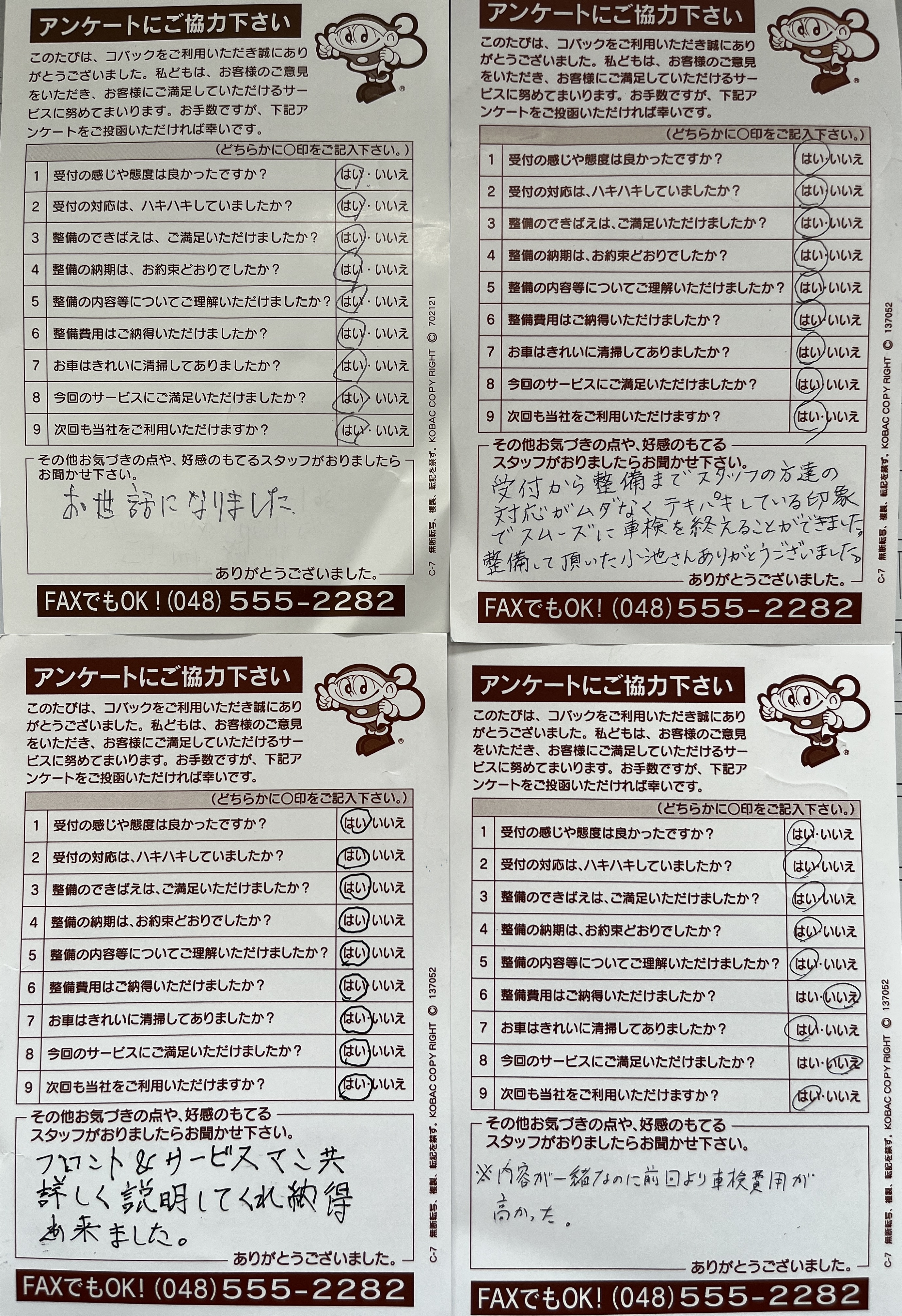 お客様からの車検後のアンケートはがき抜粋をご紹介いたします。