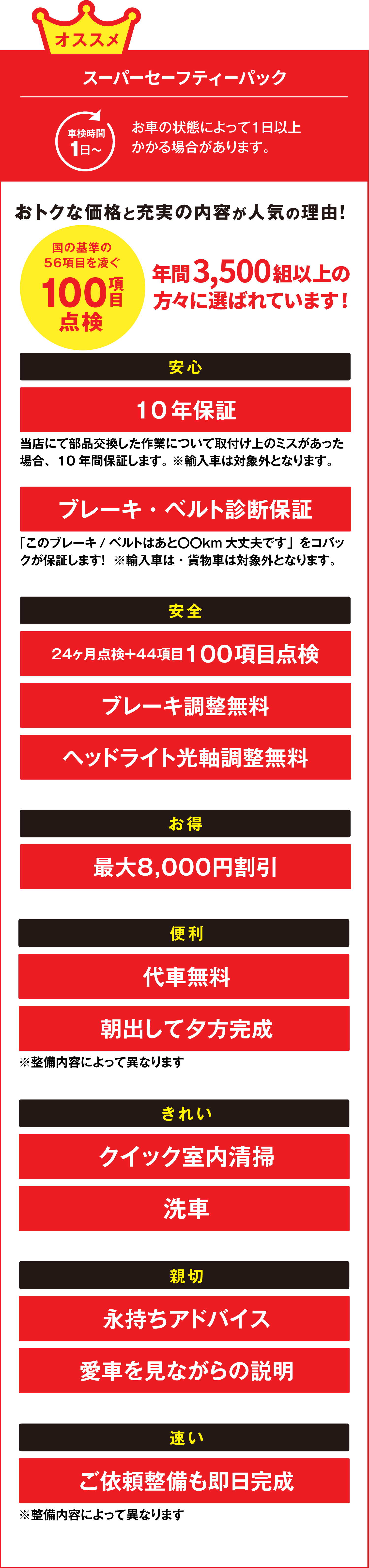 「スーパーセーフティーパック」は安心してお車に乗っていただくために充実した点検・整備を行う当社一番人気の1日車検です。
